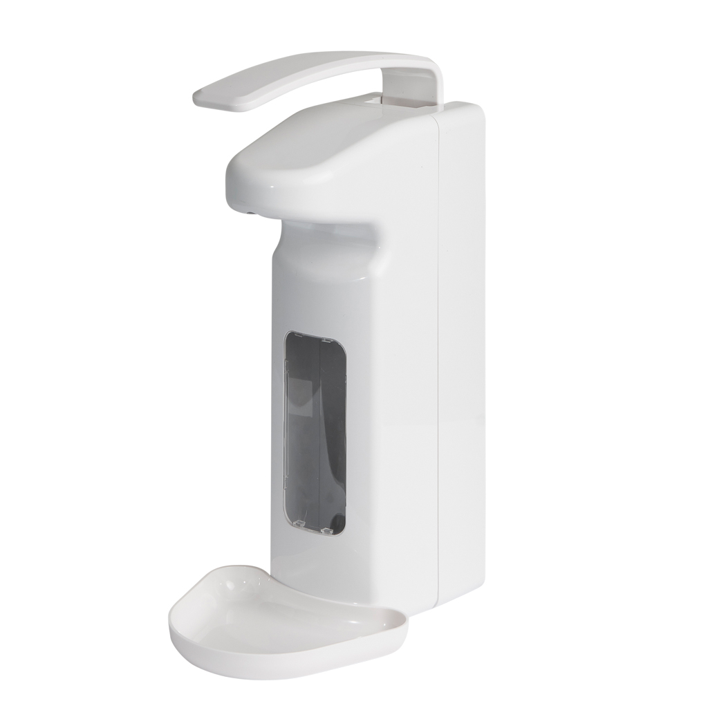 Distributeur manuel en plastique pour le système HyBag, avec égouttoir. Convient aux désinfectants, savons et lotions fluides. Indépendant du fabricant grâce à la compatibilité avec les flacons européens de 500 ml et 1000 ml (+ pompe à usage unique Ingo-Man Plus, à commander séparément).